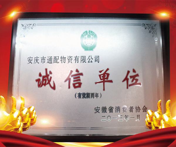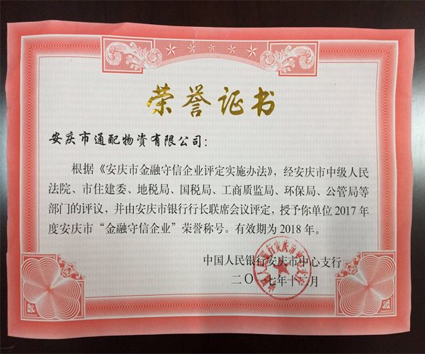 2015年6月25日,中國誠信信用管理有限公司安徽分公司通過對安慶市通配物資有限公司的誠信度、履約能力和信譽狀況的綜合分析和評估,審定為AAA資信評 ...