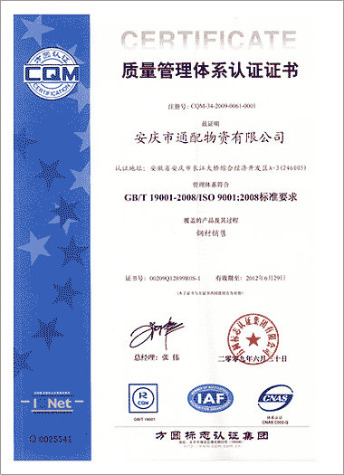 2009年6月30日,通配集團榮獲方圓標志認證集團有限公司頒發(fā)的ISO9001-2008質量管理體系認證證書,標識著集團公司順利通過了ISO9001-2008質量管理體系 ...
